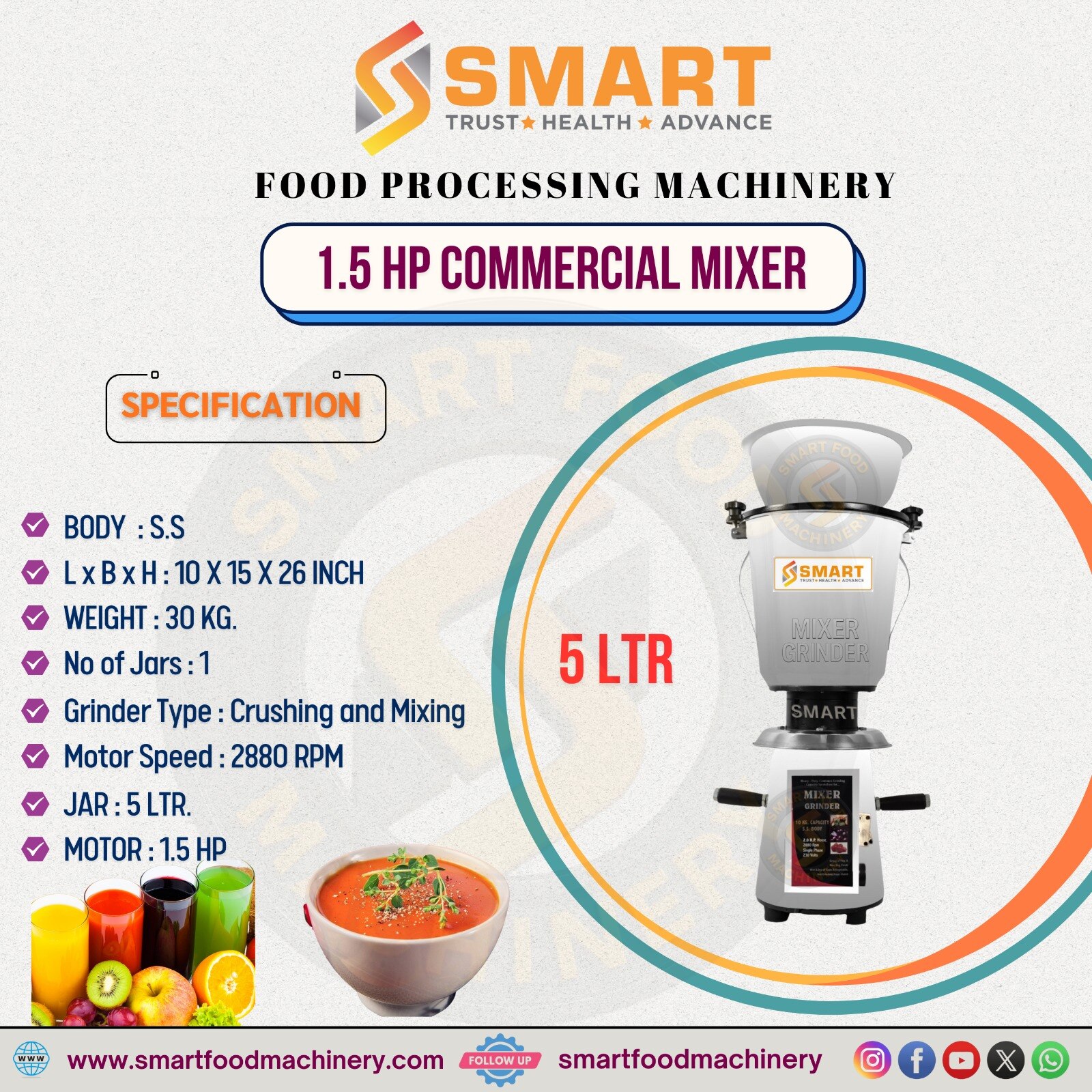 👉 1.5 HP COMMERCIAL MIXER (5 LTR) This 1.5 HP Commercial Mixer (5 Liter Jar) is designed for heavy-duty crushing and mixing applications in commercial kitchens. The machine body is made from high-quality stainless steel (S.S), ensuring hygiene, corrosion resistance, and long service life. Its compact and sturdy size of 10 x 15 x 26 inches allows easy placement while delivering powerful performance. With a total weight of 30 kg, the mixer remains stable even during continuous high-speed operation. This model comes with 1 heavy-duty jar, suitable for commercial food preparation. It supports crushing and mixing, making it ideal for gravies, chutneys, sauces, juices, and liquid-based food items. The powerful motor runs at 2880 RPM, ensuring fast, smooth, and uniform grinding results. Equipped with a 5-liter jar, it is perfect for bulk processing in hotels and restaurants. Powered by a 1.5 HP motor, the mixer delivers consistent performance for long working hours. This machine is ideal for hotels, restaurants, canteens, catering units, cloud kitchens, and food processing industries. 1.5 HP Commercial Mixer (5 LTR Jar) specially design કરવામાં આવ્યો છે restaurants, hotels, cloud kitchens, juice centers, catering units & food processing kitchens માટે, જ્યાં high volume grinding & mixing રોજિંદું કામ હોય. આ mixerમાં Full Stainless Steel (S.S) Body છે, જે એને rust-free, hygienic & food-grade બનાવે છે. Large 5 LTR jar capacity કારણે તમે gravy, chutney, paste, juice, batter, masala જેવા કામ fast અને continuous કરી શકો છો. Powerful 1.5 HP motor with 2880 RPM speed આપે છે smooth, vibration-free operation, even long working hoursમાં પણ. Crushing + Mixing dual function હોવાને કારણે productivity વધે અને time save થાય. 🔹 Key Features ✔ Powerful 1.5 HP Commercial Motor ✔ Big 5 LTR Stainless Steel Jar ✔ Crushing & Mixing – Dual Function ✔ High Speed 2880 RPM ✔ Strong & stable body – long life performance ✔ Easy cleaning & low maintenance 🔹 Best Suitable For • Hotel & Restaurant Kitchen • Cloud Kitchen & Fast Food Outlet • Juice Center & Café • Catering Service • Food Processing Unit