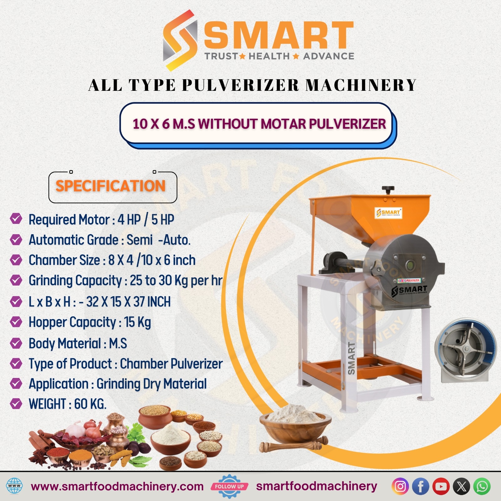 👉 10 X 6 M.S WITHOUT MOTOR PULVERIZER MACHINE (DOUBLE CHAMBER) This pulverizer requires a 4 HP or 5 HP motor for operation. It works on a Semi Automatic system for easy handling. The machine features a chamber size of 8 x 4 inch / 10 x 6 inch. It delivers a grinding capacity of 25 to 30 kg per hour. The overall machine dimensions are 32 x 15 x 37 inches. A 15 kg hopper capacity ensures smooth material feeding. The body is manufactured using M.S (Mild Steel) for durability and strength. This is a Chamber Type Pulverizer, suitable for grinding applications. It is ideal for grinding dry materials and has a total weight of 60 kg. 10 × 6 M.S. Pulverizer – Without Motor (Heavy Duty Double Chamber Pulverizer) This 10 × 6 M.S. Double Chamber Pulverizer Without Motor is specially designed for users who require a high-capacity, efficient, and continuous grinding solution and prefer to install a motor as per their own requirement. The machine is manufactured with a strong Mild Steel (M.S.) body, providing excellent strength, long durability, and stable vibration-free performance even during extended grinding operations. Equipped with a large 10 × 6 inch double chamber grinding system, this pulverizer is ideal for medium to heavy-duty grinding applications where better efficiency and output consistency are required. The double chamber design helps in improved grinding efficiency, better heat control, and smoother operation, making it suitable for regular commercial use. This model supports a 4HP to 5HP motor, allowing users flexibility to select motor power based on their production needs. It delivers a grinding capacity of approx. 25 to 30 kg per hour, depending on raw material type and mesh size. The robust double chamber construction and precision-balanced blades ensure uniform, smooth, and fine grinding, while maintaining the natural taste, aroma, and quality of grains and spices. This M.S. Double Chamber Pulverizer is ideal for grinding all types of grains and cereals such as Wheat, Rice, Maize, Bajra, Jowar, Millet, Corn, Pulses, and also all kinds of dry spices including Turmeric, Red Chilli, Coriander, Cumin, Pepper, Masala, Herbs, and other dry materials. With semi-automatic operation, large hopper capacity, and an easy maintenance design, this machine is perfectly suitable for flour mills, spice grinding units, grocery stores, food processing units, and small to medium commercial setups. The heavy-duty M.S. structure, high-capacity double chamber, and motor flexibility option make this pulverizer an excellent choice for customers looking for a reliable, cost-effective, and long-lasting grinding solution.