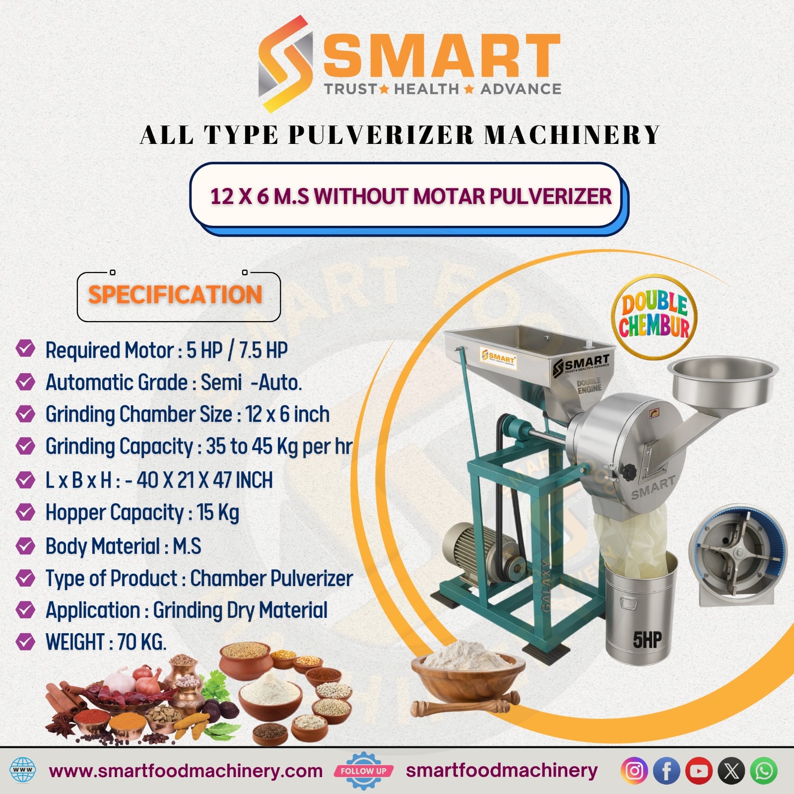 👉 12 X 6 M.S WITHOUT MOTOR PULVERIZER – DOUBLE CHAMBER This pulverizer requires a 5 HP or 7.5 HP motor for efficient operation. It works on a Semi Automatic system, suitable for continuous grinding. The machine is equipped with a 12 x 6 inch DOUBLE GRINDING CHAMBER. It delivers a grinding capacity of 35 to 45 kg per hour. The overall machine dimensions are 40 x 21 x 47 inches. A 15 kg hopper capacity ensures smooth and uninterrupted feeding. The body is manufactured using M.S (Mild Steel) for long-lasting durability. This is a DOUBLE CHAMBER TYPE PULVERIZER, ideal for higher output. It is suitable for grinding dry materials only. The total machine weight is 70 kg. 12 × 6 M.S. Pulverizer – Without Motor (Double Chamber, Heavy Duty) This 12 × 6 M.S. Pulverizer Double Chamber Without Motor is designed for users who need high-output, continuous grinding performance and want the flexibility to install a motor as per their production requirement. The machine is manufactured with a strong Mild Steel (M.S.) body, ensuring excellent durability, structural strength, and vibration-free operation during long working hours. Equipped with a large 12 × 6 inch double chamber grinding system, this pulverizer is ideal for heavy-duty commercial and industrial grinding applications. The double chamber design helps in better heat dissipation, improved efficiency, and consistent grinding quality, making it suitable for continuous use. This model supports a 5HP to 7.5HP motor, allowing users to select motor power based on required capacity and workload. It delivers a grinding capacity of approx. 35 to 45 kg per hour, depending on raw material type and mesh size. The robust SMART double chamber construction with precision-balanced blades ensures smooth, uniform, and fine grinding, while maintaining the natural aroma, taste, and quality of grains and spices. This M.S. Double Chamber Pulverizer is suitable for grinding all types of grains and cereals such as Wheat, Rice, Maize, Bajra, Jowar, Millet, Corn, Pulses, and also all kinds of dry spices including Turmeric, Red Chilli, Coriander, Cumin, Pepper, Masala, Herbs, and other dry materials. With semi-automatic operation, 15 kg hopper capacity, and an easy maintenance design, this machine is perfectly suitable for flour mills, spice grinding units, grocery stores, food processing units, hotels, and medium to large commercial setups. The heavy-duty M.S. struture, high-capacity double chamber, and motor flexibility (5HP / 7.5HP) make this pulverizer a reliable, cost-effective, and long-lasting grinding solution for professional use.