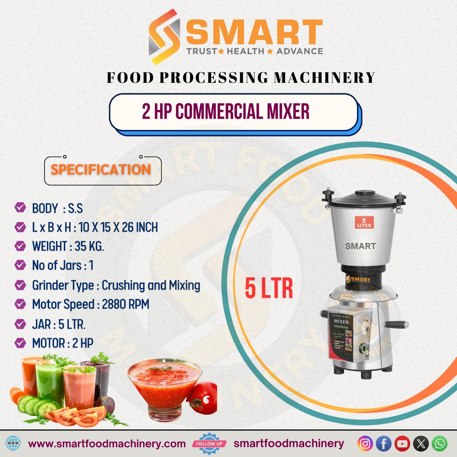 👉 2 HP COMMERCIAL MIXER (5 LTR) This 2 HP Commercial Mixer is designed for high-performance crushing and mixing in professional food preparation environments. The body is made from premium-quality stainless steel (S.S), ensuring hygiene, durability, and resistance to corrosion. Its compact and strong build with dimensions of 10 x 15 x 26 inches allows easy installation while handling heavy-duty workloads. With a total weight of 35 kg, the machine offers excellent stability during continuous operation. This model is supplied with 1 heavy-duty jar, suitable for commercial use. It supports crushing and mixing applications, making it ideal for gravies, chutneys, sauces, juices, and liquid food items. The powerful motor runs at 2880 RPM, delivering fast, smooth, and consistent grinding results. Equipped with a 5-liter jar, it is perfect for bulk food processing needs. Powered by a 2 HP motor, this mixer ensures reliable performance even during long working hours. This machine is ideal for hotels, restaurants, catering services, canteens, cloud kitchens, and food processing units. 2 HP Commercial Mixer – 5 LTR The 2 HP Commercial Mixer (5 LTR Jar) is designed for heavy-duty commercial use in hotels, restaurants, cloud kitchens, catering units, and juice centers. Powered by a strong 2 HP motor with 2880 RPM, this machine delivers fast, smooth, and consistent grinding and mixing performance. Its full stainless steel (S.S) body ensures hygiene, corrosion resistance, and long service life. The 5-liter jar capacity is ideal for preparing gravies, chutneys, masala pastes, sauces, juices, and batter in bulk quantities. The mixer supports both crushing and mixing functions, making it a versatile solution for daily commercial operations. The machine is compact yet robust, built for continuous operation with low vibration, stable performance, and minimal maintenance. This mixer is an excellent choice for businesses looking for reliability, efficiency, and professional-grade output. Ideal for: Hotels, Restaurants, Catering Services, Cloud Kitchens, Food Processing Units Key Benefits: Heavy-duty motor, hygienic SS body, high efficiency, durable design, smooth operation