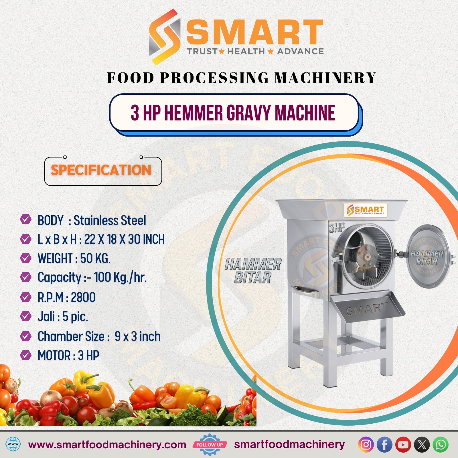 👉 3 HP HAMMER GRAVY MACHINE This machine is designed for high-efficiency gravy and paste preparation using hammer-type grinding technology. The body is made of premium Stainless Steel, ensuring hygienic operation, corrosion resistance, and long durability. The overall machine dimensions are 22 x 18 x 30 inches, providing a strong and stable structure. The total machine weight is 50 kg, ensuring vibration-free and smooth operation. It delivers a high grinding capacity of up to 100 kg per hour, ideal for continuous commercial use. The machine runs at 2800 RPM, offering fast, smooth, and uniform grinding output. It is equipped with 5 jali (screens) for different gravy and paste texture requirements. The grinding chamber size is 9 x 3 inches, suitable for large-volume gravy processing. Powered by a 3 HP motor, it provides powerful and reliable performance with low maintenance. This hammer gravy machine is ideal for hotels, restaurants, catering services, cloud kitchens, and food processing units. 3 HP Hammer Gravy Machine – High Performance Food Processing Solution This 3 HP Hammer Gravy Machine is specially engineered for high-capacity wet grinding applications, making it an ideal choice for commercial kitchens and professional food processing units. The machine is manufactured with a full stainless steel body, ensuring food-grade hygiene, corrosion resistance, easy cleaning, and long service life. Powered by a robust 3 HP motor operating at 2800 RPM, this machine delivers powerful, smooth, and continuous grinding performance. With a production capacity of up to 100 kg per hour, it is perfectly suitable for medium to large-scale operations where speed and consistency are essential. The 9 × 3 inch grinding chamber combined with hammer-type grinding technology ensures finer texture, uniform output, and faster processing compared to conventional gravy machines. Equipped with 5 different jali (screens), it allows users to achieve custom grinding fineness as per different food preparation needs. This Hammer Gravy Machine is widely used for preparing onion paste, tomato puree, ginger-garlic paste, chilli paste, curry base, wet masala, gravies, and other wet food ingredients. It is highly recommended for hotels, restaurants, cloud kitchens, caterers, canteens, hostels, food factories, and bulk cooking units. With a compact yet heavy-duty design (22 × 18 × 30 inch) and a solid 50 kg structure, the machine offers stable, vibration-free operation, reducing labour effort and improving productivity. The combination of stainless steel construction, hammer grinding system, and a powerful 3 HP motor makes this 3 HP Hammer Gravy Machine a reliable, efficient, and cost-effective investment for any professional food processing setup.