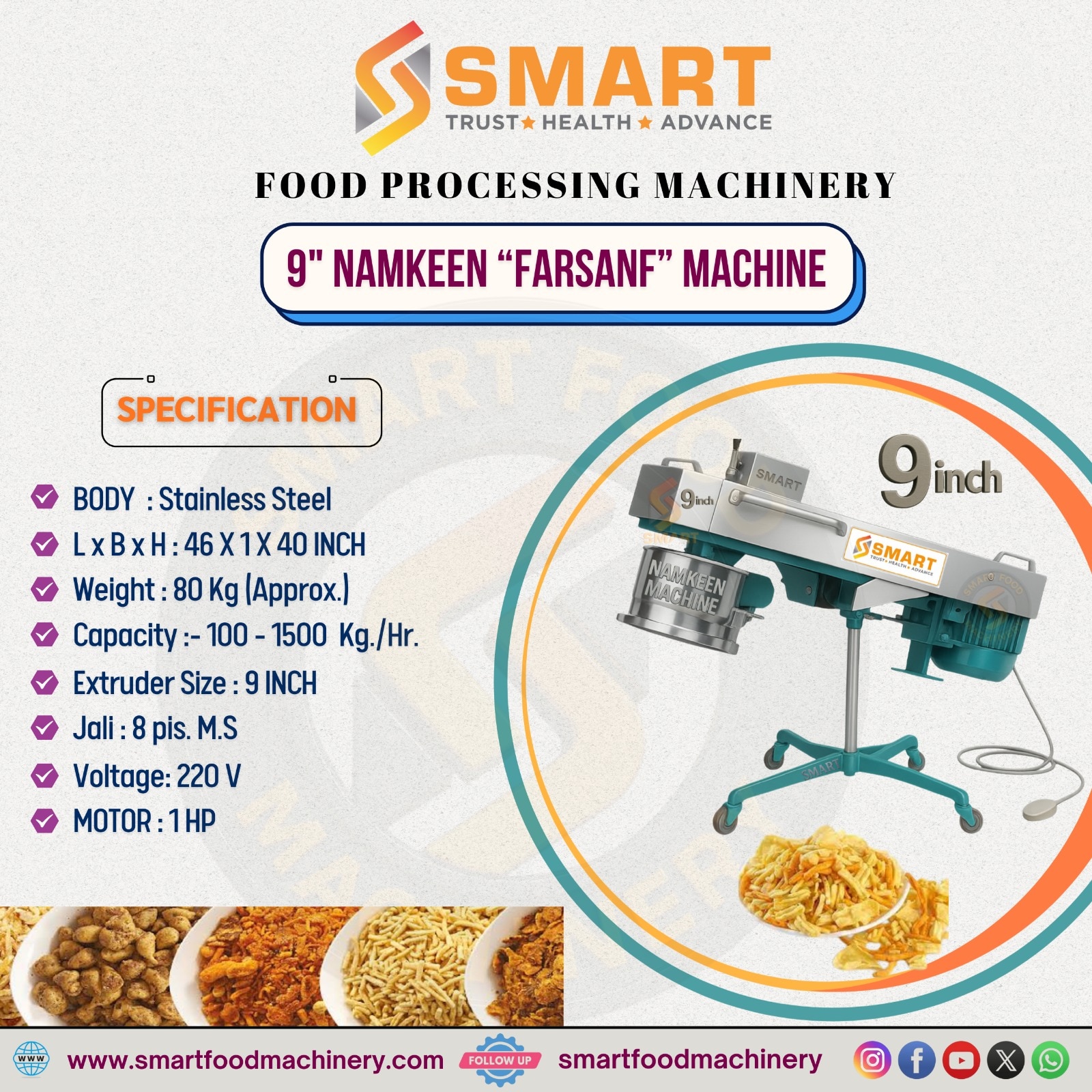 👉 9" NAMKEEN “FARSAN” MACHINE The 9 Inch Namkeen “Farsan” Machine is a heavy-duty commercial solution designed for high-volume namkeen and farsan production with consistent quality and superior performance. Built with a full stainless steel body, this machine ensures maximum hygiene, corrosion resistance, and long-term durability for continuous industrial use. With overall dimensions of 46 x 11 x 40 inches, the machine offers a strong and stable structure while remaining suitable for organized production floors. The approximate weight of 80 kg provides excellent operational stability and minimizes vibration during continuous operation. This model delivers a powerful production capacity of 100–150 kg per hour, making it ideal for large-scale namkeen and farsan manufacturers. Equipped with a 9 inch extruder size, it allows smooth dough flow and uniform extrusion for various farsan shapes. The machine comes with 8 pieces of M.S jali, enabling flexibility to produce multiple namkeen varieties such as sev, gathiya, bhujia, and farsan snacks. It operates on a 220V power supply, suitable for standard commercial electrical connections. Powered by a 1 HP motor, the machine ensures strong, smooth, and energy-efficient performance even during long working hours. This farsan machine is widely used in namkeen manufacturing units, farsan factories, sweet shops, snack production units, catering kitchens, and food processing industries, where reliability, high output, and consistent product quality are essential. This 9 Inch Namkeen “Farsan” Machine is designed for high-capacity, continuous production of a wide range of traditional Indian namkeen and farsan snacks. It is perfectly suitable for large namkeen manufacturers, commercial snack units, farsan factories, and sweet & namkeen production businesses that require consistent quality with higher output. The machine is widely used to prepare products such as sev, gathiya, bhujia, ratlami sev, aloo sev, nylon sev, papdi gathiya, and other extruded farsan items. The large 9-inch extruder ensures smooth dough flow and uniform shape, making it ideal for bulk production without compromising texture or taste. Operation is simple and efficient. Prepared dough is fed into the chamber, the required jali is selected, and the machine starts extruding farsan continuously. The stable structure and balanced design allow vibration-free operation, ensuring consistent results during long working hours. SMART Namkeen Machines are built using premium-grade stainless steel, maintaining high hygiene standards and long-lasting durability. The strong body, powerful motor, and precision engineering help reduce manual effort while increasing productivity and reliability. Choosing SMART means choosing performance, durability, and trust. SMART machines are preferred by professionals for their smooth operation, excellent output quality, and dependable performance in demanding commercial namkeen and farsan production environments.