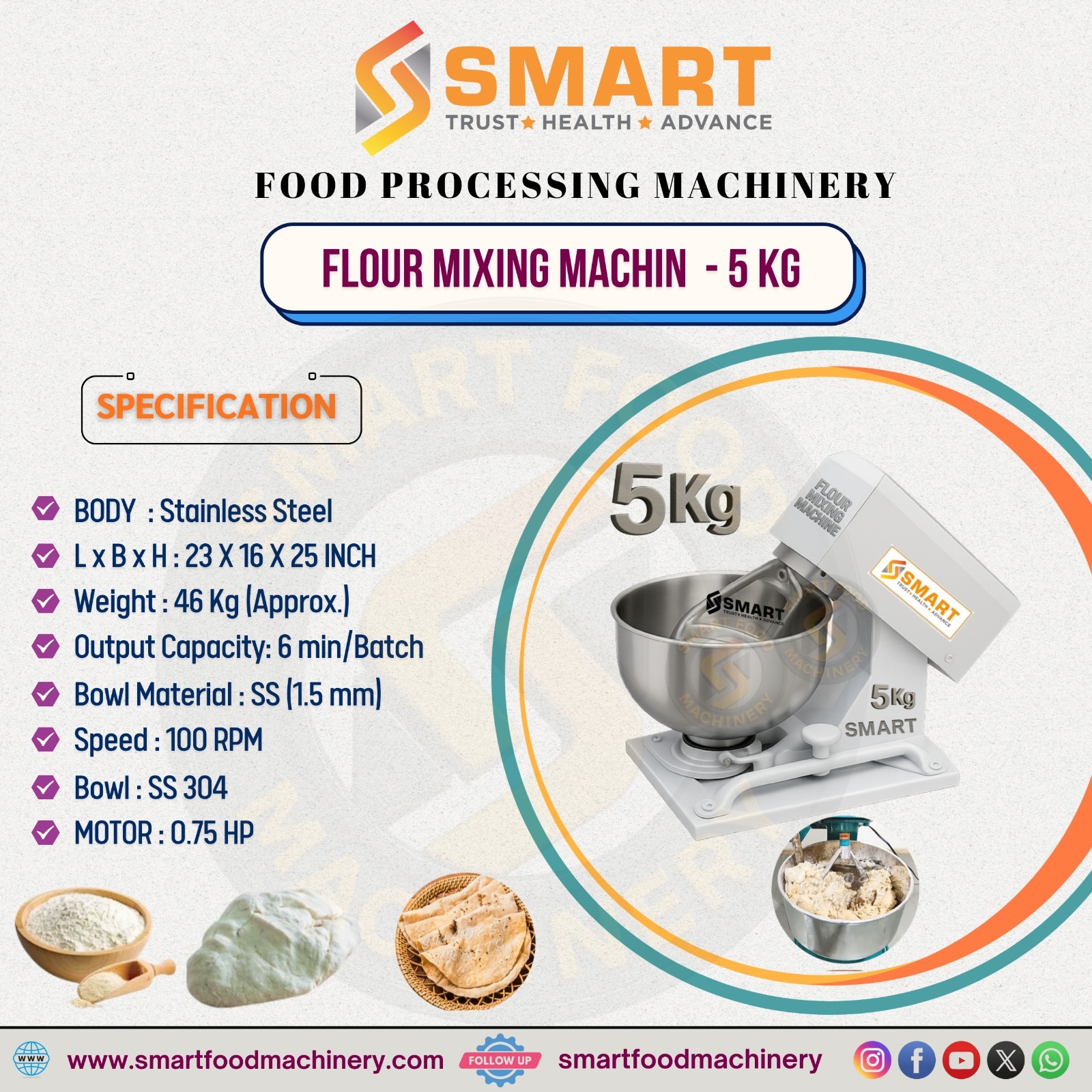 👉 FLOUR MIXING MACHINE – 5 KG The Flour Mixing Machine – 5 KG is designed for fast, uniform, and hygienic mixing of flour and dough, making it ideal for commercial kitchens, bakeries, hotels, restaurants, and food processing units. Manufactured with a heavy-duty stainless steel body, this machine ensures long-lasting durability, corrosion resistance, and easy maintenance. With compact dimensions of 23 x 16 x 25 inches, it is space-efficient and suitable for both small and medium-scale operations. The machine has an approximate weight of 46 kg, providing excellent stability during operation. It delivers efficient performance with an output capacity of 6 minutes per batch, saving time and labor. The mixing bowl is made from high-quality SS material with 1.5 mm thickness, ensuring strength and food safety. Operating at a controlled speed of 100 RPM, it ensures smooth and uniform dough mixing without overheating. The SS 304 bowl guarantees hygiene and compliance with food-grade standards. Powered by a 0.75 HP motor, the machine offers reliable, powerful, and consistent performance for daily use. This flour mixing machine is widely used for preparing dough for roti, chapati, naan, bakery items, and other flour-based products, making it an essential asset for efficient food preparation operations. Flour Mixing Machine – 5 KG (SMART Food Processing Machinery) The SMART 5 KG Flour Mixing Machine is a compact and efficient solution for quick and uniform dough preparation. It is specially designed for small commercial kitchens and food businesses that require consistent dough quality with minimum effort. This machine is ideal for mixing wheat flour, atta, maida, and similar ingredients to prepare soft and well-kneaded dough. The stainless steel body and food-grade SS 304 bowl ensure hygiene, durability, and safe food processing. With a balanced mixing speed, it delivers smooth and evenly mixed dough in every batch without overheating or damaging the texture. How to Use: Add the flour and required amount of water into the bowl, start the machine, and allow it to mix automatically. Within a few minutes, perfectly mixed dough is ready. The tilting head and open bowl design make unloading and cleaning simple and fast. Applications: This machine is widely used in hotels, restaurants, snack centers, cloud kitchens, bakeries, small sweet shops, canteens, and catering units. Why Choose SMART: SMART machines are known for their strong build, reliable performance, easy operation, and low maintenance. The 5 KG Flour Mixing Machine helps save time, reduce manual labor, and improve productivity, making it a smart and cost-effective choice for everyday dough preparation.
