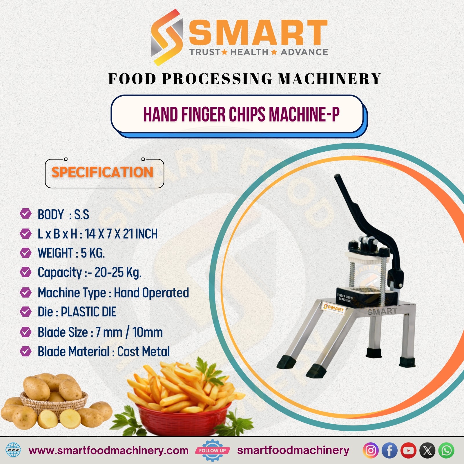 👉 HAND FINGER CHIPS MACHINE – (Plastic Die Model) This Hand Finger Chips Machine – P Model is specially designed for easy and efficient manual cutting of potatoes into uniform finger chips. The machine body is made from high-quality stainless steel (S.S), ensuring durability, hygiene, and rust resistance. Its compact size of 14 x 7 x 21 inches makes it ideal for small kitchens, food stalls, and mobile setups. With a lightweight structure of only 5 kg, the machine is easy to handle and move. It offers a production capacity of 20–25 kg, suitable for small to medium-scale food preparation. This is a hand-operated machine, requiring no electricity and minimal maintenance. The machine is equipped with a plastic die, designed for smooth operation and cost-effective performance. It supports 7 mm and 10 mm blade sizes, allowing flexibility in finger chip thickness. The blades are made from cast metal, ensuring sharp cutting edges and long service life. This machine is ideal for street food vendors, fast food counters, canteens, snack shops, and small restaurants. Hand Finger Chips Machine – P (Plastic Die Model) Compact • Economical • Easy to Use The Hand Finger Chips Machine – P Model is a cost-effective and user-friendly hand-operated machine, specially designed for small food businesses, street vendors, snack counters, canteens, and home-based production units. This model comes with a strong Stainless Steel (S.S) body, ensuring better hygiene, corrosion resistance, and long life. Its plastic die system makes the machine lighter in weight, smoother in operation, and more economical, while still delivering uniform and clean finger chips cutting. With a compact size of 14 × 7 × 21 inch and a lightweight design of just 5 kg, this machine is easy to carry, easy to place, and perfect for small spaces. The hand-operated mechanism works without electricity, making it ideal for mobile stalls, roadside vendors, and low-power locations. The machine supports 7 mm and 10 mm blade sizes, allowing you to produce perfectly shaped finger chips as per customer demand. Its cast metal blades ensure sharp cutting, consistent output, and long-lasting performance. With a production capacity of 20–25 kg per hour, this model helps increase productivity while reducing manual effort. The sturdy legs provide good stability during operation, ensuring safe and smooth usage.