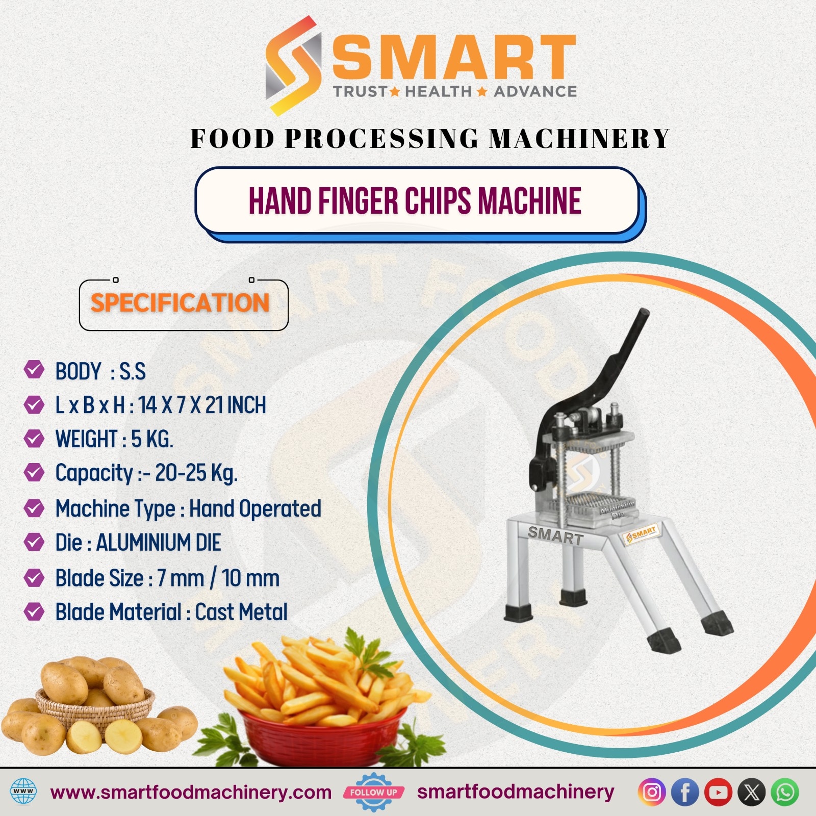 👉 OIL DRYER MACHINE The Oil Dryer Machine is specially designed to remove excess oil from fried food products, making it ideal for namkeen, farsan, snacks, chips, and other fried items used in commercial food production. Manufactured with a high-quality stainless steel body, the machine ensures excellent hygiene, corrosion resistance, and long-term durability. With compact dimensions of 35 x 21 x 30 inches, it is suitable for food processing units, sweet shops, snack manufacturers, and commercial kitchens. The machine has a strong build with a total weight of 71 kg, providing stable and vibration-free operation during high-speed use. It offers an efficient capacity of 12–15 kg per batch, helping improve product quality while reducing oil content. Operating at a high speed of 1440 RPM, the oil dryer ensures quick and effective oil separation. The manual control system allows easy operation and low maintenance requirements. Equipped with a 12“ x 14” stainless steel 304 jali basket, it ensures strength, hygiene, and uniform oil drainage. Powered by a robust 1 HP motor, the machine delivers consistent performance with reliable output. This oil dryer machine is an excellent solution for enhancing snack quality, improving shelf life, and maintaining a clean, professional food production process. Oil Dryer Machine – SMART Food Processing Machinery The SMART Oil Dryer Machine is designed to efficiently remove excess oil from fried food products, helping improve taste, texture, and shelf life. It is widely used after frying namkeen, farsan, chips, sev, bhujia, snacks, and similar food items to achieve a clean, dry, and premium finish. Purpose & Use: After frying, hot food items are placed inside the stainless steel basket of the oil dryer. When the machine is switched on, high-speed rotation removes extra surface oil through centrifugal force. The drained oil is collected separately, making the process clean and economical. How It Is Used: Simply load the fried product into the basket, close the lid securely, and operate the machine manually for a short cycle. Within minutes, the food becomes oil-free on the surface, crispy, and ready for seasoning or packing. Why SMART Oil Dryer Machine: This machine ensures better product quality, reduced oil consumption, and healthier snacks. Its stainless steel body maintains hygiene, while the powerful motor delivers consistent performance batch after batch. Easy operation, low maintenance, and reliable output make it a smart choice for sweet shops, namkeen manufacturers, snack producers, and food processing units looking for professional results.